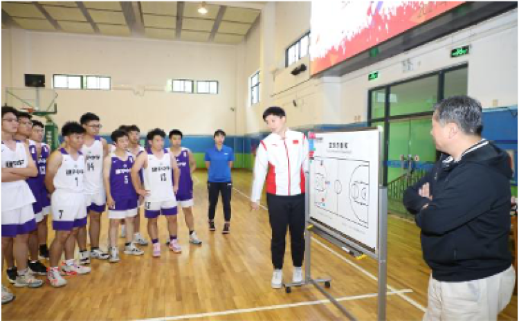 升旗仪式结束后,张芷婷一行移步篮球馆,与校女篮、男篮运动员们亲密互动,亲身示范并带领队员们做敏捷梯步法的热身练习,传授训练干货。她还向队员们传授了篮球3V3经典战术,带领队员们进行了实战演练。