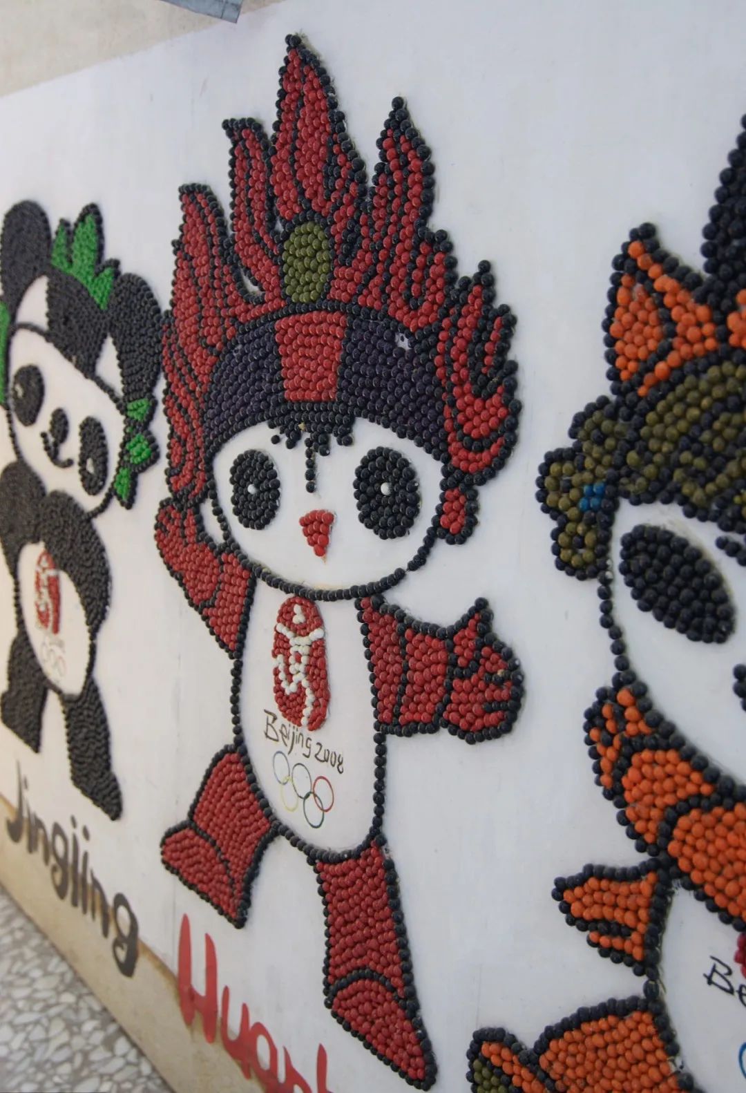 2008年4月29日,吉林市第三中学师生用彩豆创作五福娃,喜迎北京奥运会倒计时100天。