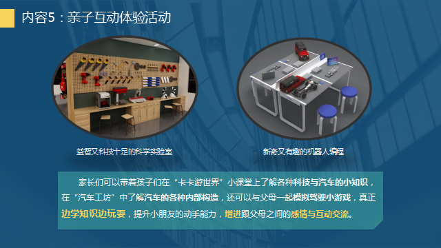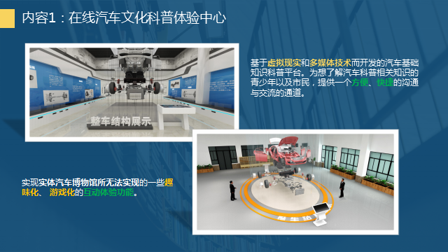 本次展出的活动主题为“探汽车奥秘-创智慧出行”,以VR、AR技术,依托多媒体信息化平台,通过汽车文化、智能网联汽车、新能源汽车、智能智造虚拟体验空间、汽车趣味游戏、亲子互动体验、“互联网+”等7个方面的多媒体数字化科普活动,向广大市民传播汽车文化、构造和动力科普知识;展示三维空间漫游、三维虚拟操控等科技功能;了解物联传感和智能故障检测技术;感受Unity纯三维引擎交互技术与VR虚拟现实技术,进行烘焙渲染,输出的大型超炫虚拟场景,清晰展示汽车的内部构造和运行原理,让体验者身临其境般地探索汽车之旅。