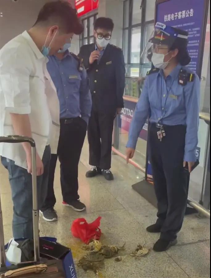 日前,浙江省永康南站,一名男乘客携带一袋活螃蟹乘坐高铁时,乘务员进行劝阻,称螃蟹严重污染环境,不能携带。随后,男乘客当场踩死约8只螃蟹后带上车。