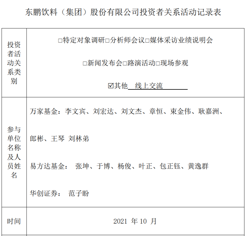 11月2日,东鹏饮料公布的信息显示,易方达基金张坤等人10月份以线上交流的方式调研了公司。