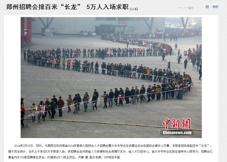 根据TinEye图片搜索发现,这张照片实际上拍摄于2014年2月15日,拍摄地点位于中国河南省郑州市国际会展中心。照片内容实际为河南省2014年春季大型综合人才招聘会开幕的场景。