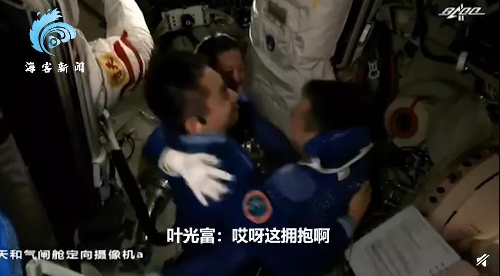 在出舱活动圆满成功后,叶光富迎接翟志刚、王亚平进舱,三人组紧紧相拥庆祝出舱成功,场面令人感动!
