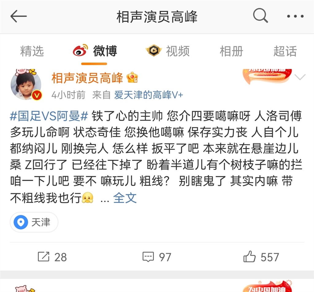 国足的“主场”比赛吸引无数中国球迷熬夜关注,这其中还有一位特殊球迷——德云社演员高峰。他也用谐音梗点评了这场比赛。“铁了心的主帅,您介四要噶嘛呀,人洛司傅多玩儿命啊,状态奇佳!您换他噶嘛?保存实力丧,人自个儿都纳闷儿, 刚换完人,恁么样,扳平了吧? 本来就在悬崖边儿桑,这回行了, 已经往下掉了, 盼着半道儿有个树枝子嘛的拦咱一下儿吧。 要不嘛玩儿粗线? 别瞎鬼了,其实内嘛, 带不粗线我也行。”