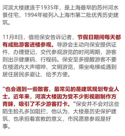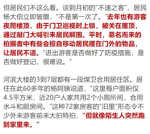 刚买下河滨大楼高层房屋的陶女士也颇有怨言。“平时就有游客随机地走进楼道里拍照,让人很不自在。”她希望,大楼能升级安防措施,如加装门禁、摄像头,如此才能有效限制、及时劝阻可能影响居民的游客。为此,她多次向12345市民服务热线反映。、