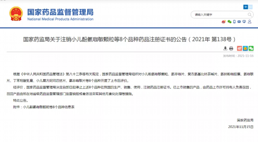 11月16日,国家药监局发布关于注销小儿酚氨咖敏颗粒等8个品种药品注册证书的公告。