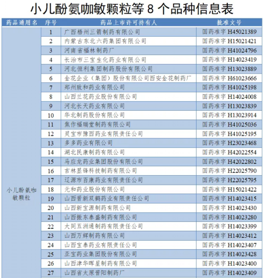 经评价,国家药品监督管理局决定自即日起停止上述8个品种在我国的生产、销售、使用,注销药品注册证书。其中,小儿酚氨咖敏颗粒涉及的药品上市持有人达37家,包括华北制药、马应龙药业等。