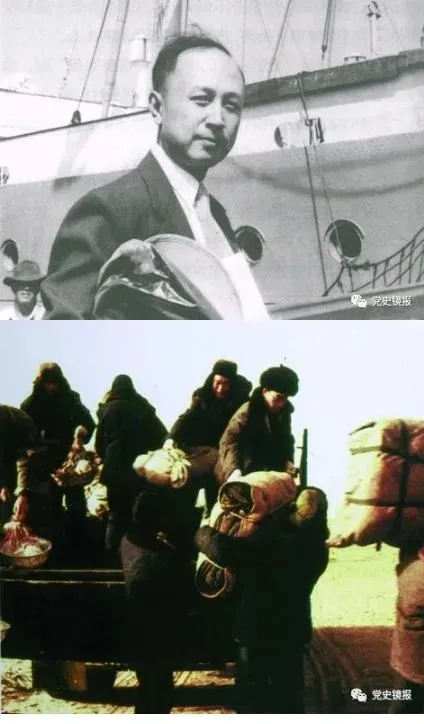 △上图为1955年9月17日,钱学森登上“克利夫兰总统号”邮轮;下图为抵达211基地(中国第一个核武器研制、试验和生产基地)的科研生产人员