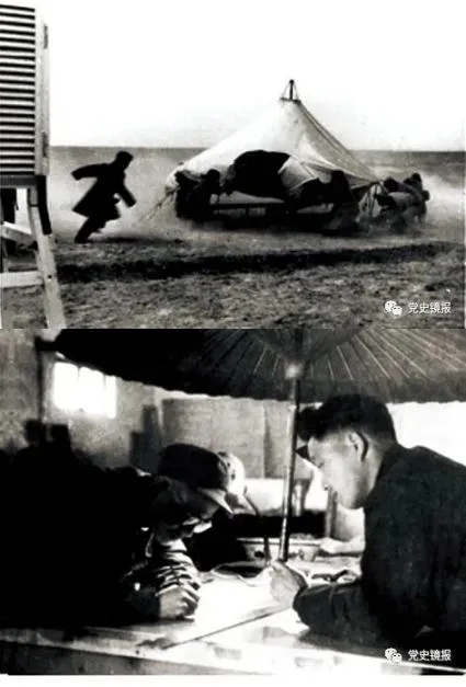 △上图为大风沙来临时科研人员加固帐篷;下图为实验基地房屋漏雨,科学家们打着雨伞进行研究