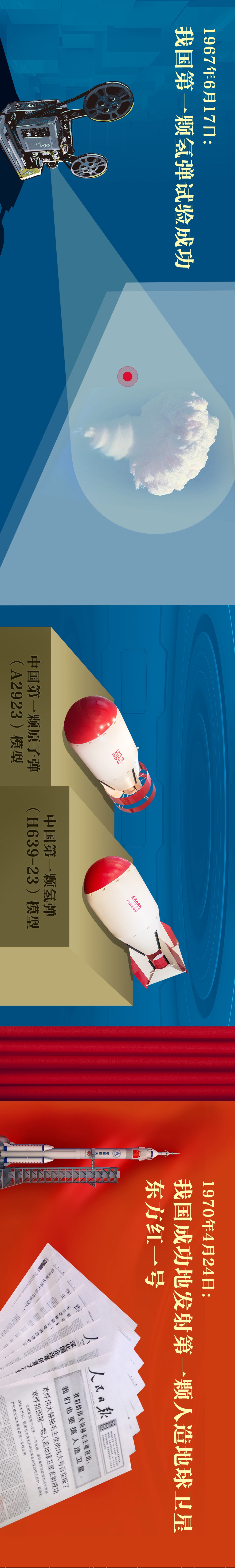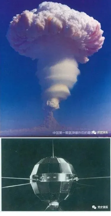 △上图为中国第一颗氢弹爆炸后的蘑菇云;下图为1970年4月24日,中国成功发射第一颗人造地球卫星
