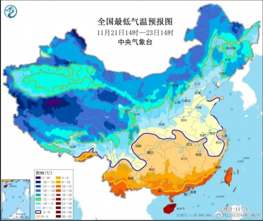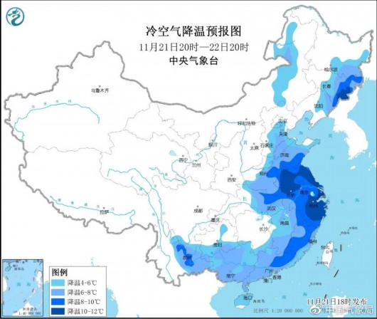 中央气象台在11月21日发布的寒潮蓝色预警显示,21日至23日,我国中东部地区将有4级到6级偏北风,阵风7~9级,气温下降6℃到10℃,其中,黄淮东部、江淮、江南中东部等地的部分地区降温幅度可达12℃,局地14℃以上。