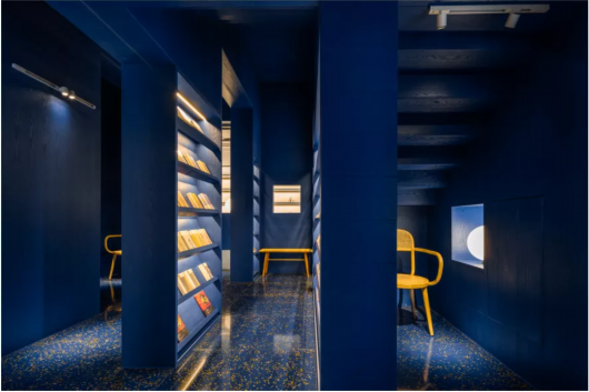店里分为书籍区、周边文创区和饮食休闲区三大区域,由蓝色为主色调的通道相连。同时书店各个角落书架也是蓝色为主基调。