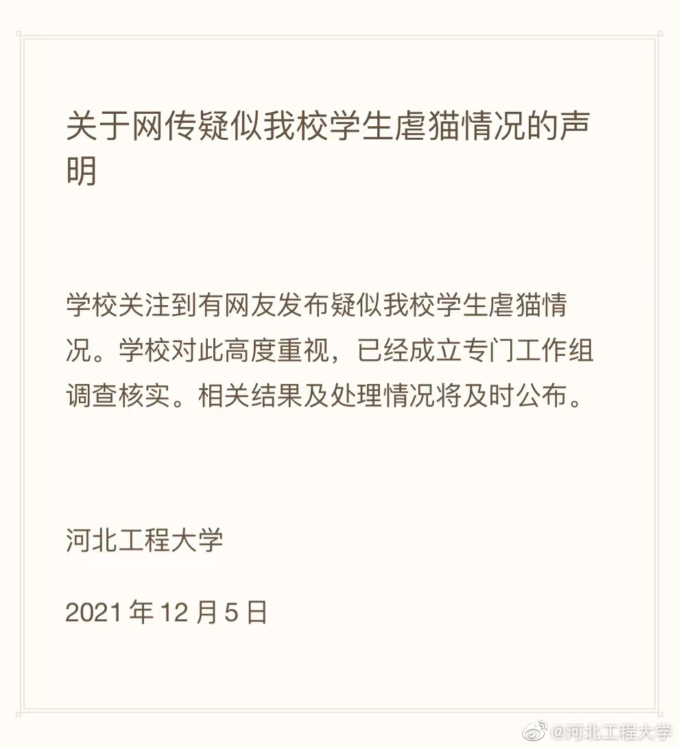 河北工程大学12月5日发布《关于网传疑似我校学生虐猫情况的说明》: