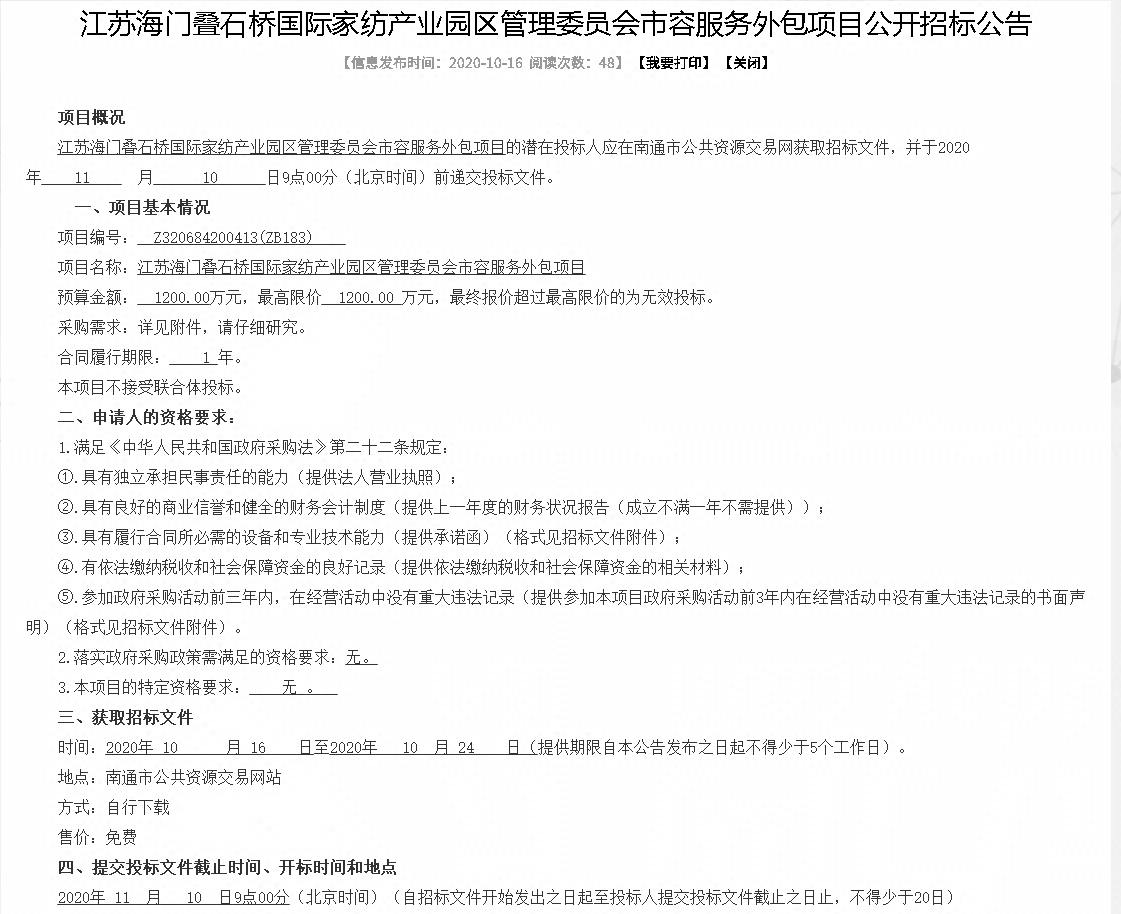 南通市公共资源交易网招标公告显示,该项目名称为“江苏海门叠石桥国际家纺产业园区管理委员会市容服务外包项目”,招标文件发布于2020年10月16日,中标公告发布于当年11月10日。