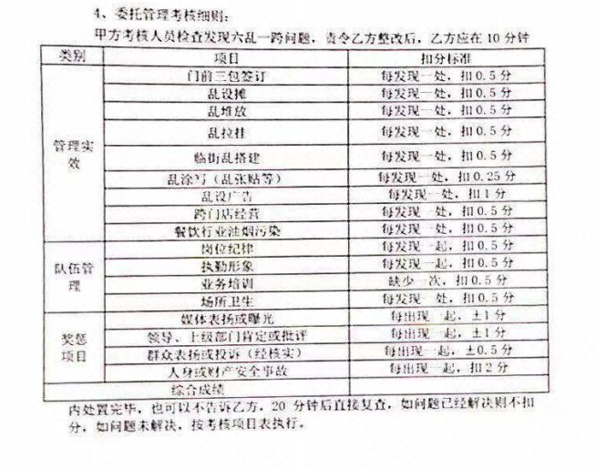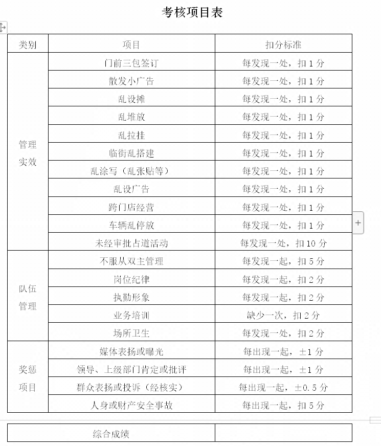 考核项目中包含管理时效,队伍管理与奖惩项目。其中,每发现一处乱设摊扣1分,每出现一起被媒体曝光扣1分,每出现一起经核实的群众投诉扣0.5分。