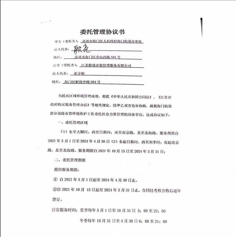 该项目采购方为南通市海门区人民政府海门街道办事处,静通市容中标金额为2400余万元。两方就此项目签订的《委托管理协议书》显示,该项目服务期限自2021年5月1日至2024年4月30日。其中,2021年10月15日起至2024年3月31日止,合同经考核合格后逐年签订。