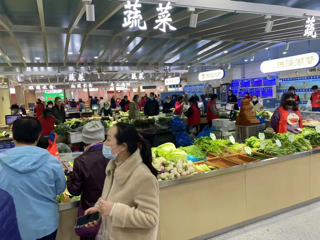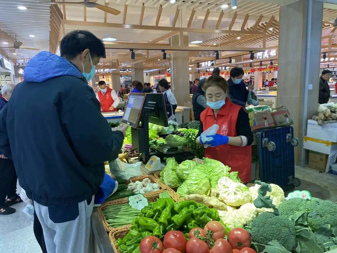 一楼是全新升级的长桥菜市场,入口处的自动测温仪免去了百姓等待的时间。