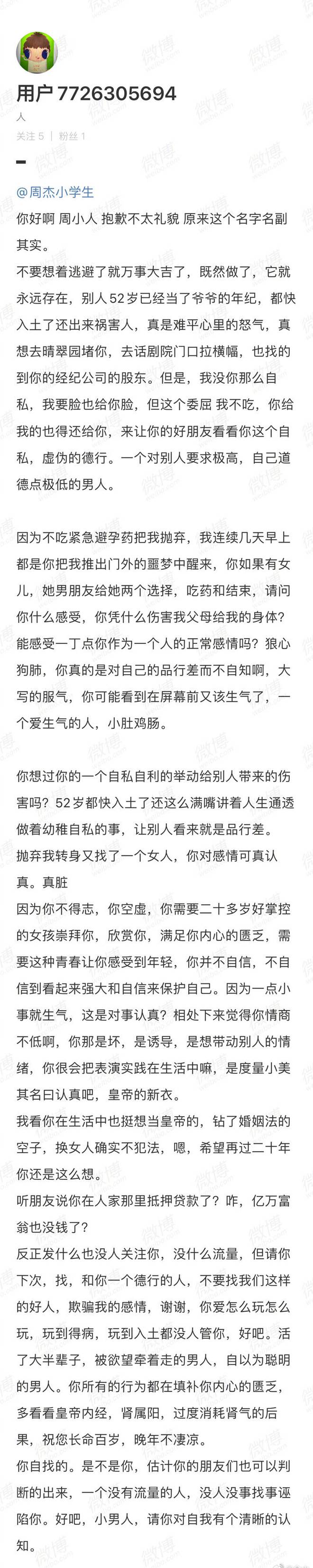 该博主还提到周杰疑似因缺钱抵押贷款,文中称“因为你不得志,你空虚,你需要二十多岁好掌控的女孩崇拜你,欣赏你,满足你内心的匮乏,需要这种青春让你感受到年轻,你并不自信,不自信到看起来强大和自信来保护自己。因为一点小事就生气,这是对事认真?”“反正发什么也没人关注你,没什么流量,但请你下次,找和你一个德行的人,不要找我们这样的好人,欺骗我的感情。”