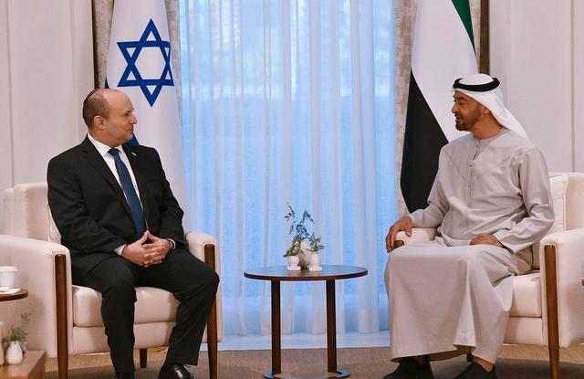 13日,贝内特与阿布扎比王储穆罕默德举行会谈,两人共相处四个多小时,比原计划延长两小时,其中两个半小时是私下会谈。阿联酋政府发布的照片和无声视频显示,两位领导人相谈甚欢,穆罕默德还一度在以色列总理耳边低语。