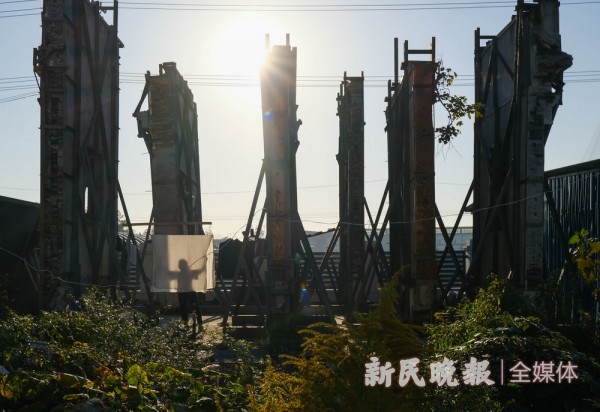 在杨树浦路广德路路口,立着7扇百岁高龄的门楼。因杨树浦路动迁工程进行中,日后它们或将作为开发地块的建筑构件继续使用。11月里的一天,在附近作业的工人趁着好天气晾晒床单。 本报记者 陈梦泽 摄