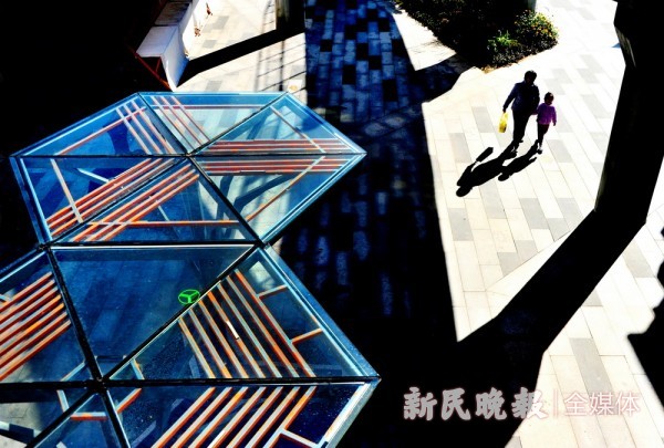 上海街区景色越来越美。漫步街头社区,美景无处不在。正午暖阳洒在曹杨街区百禧公园里,路人身影与街面的廊棚投影相互映和,仿佛一幅套色版画。 杨建正 摄