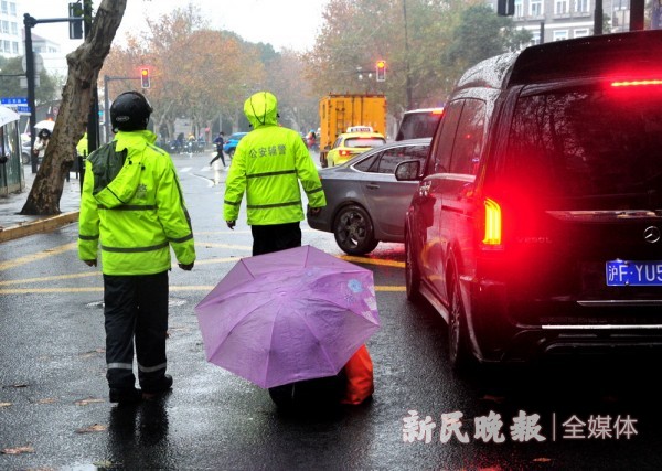 12月12日下午,愚园路上细雨濛濛,一女士被途经车辆撞倒。2名路口执勤辅警立马赶来,用身体筑起临时安全屏障,避免伤者遭受二次伤害。他们在雨中足足坚守了15分钟,直到120到场。杨建正 摄