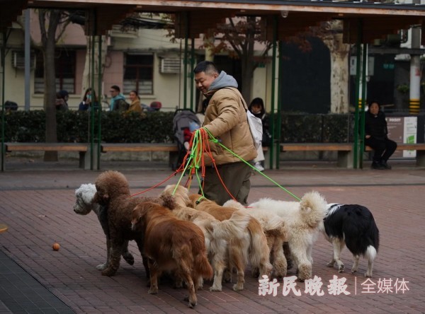 位于永嘉路的嘉澜庭“口袋广场”,一名男士手中的红绿狗绳格外醒目。一群狗狗跟在他身后,引得众人围观。为何他会有那么多条狗?难道是职业遛狗师?首席记者 刘歆 摄