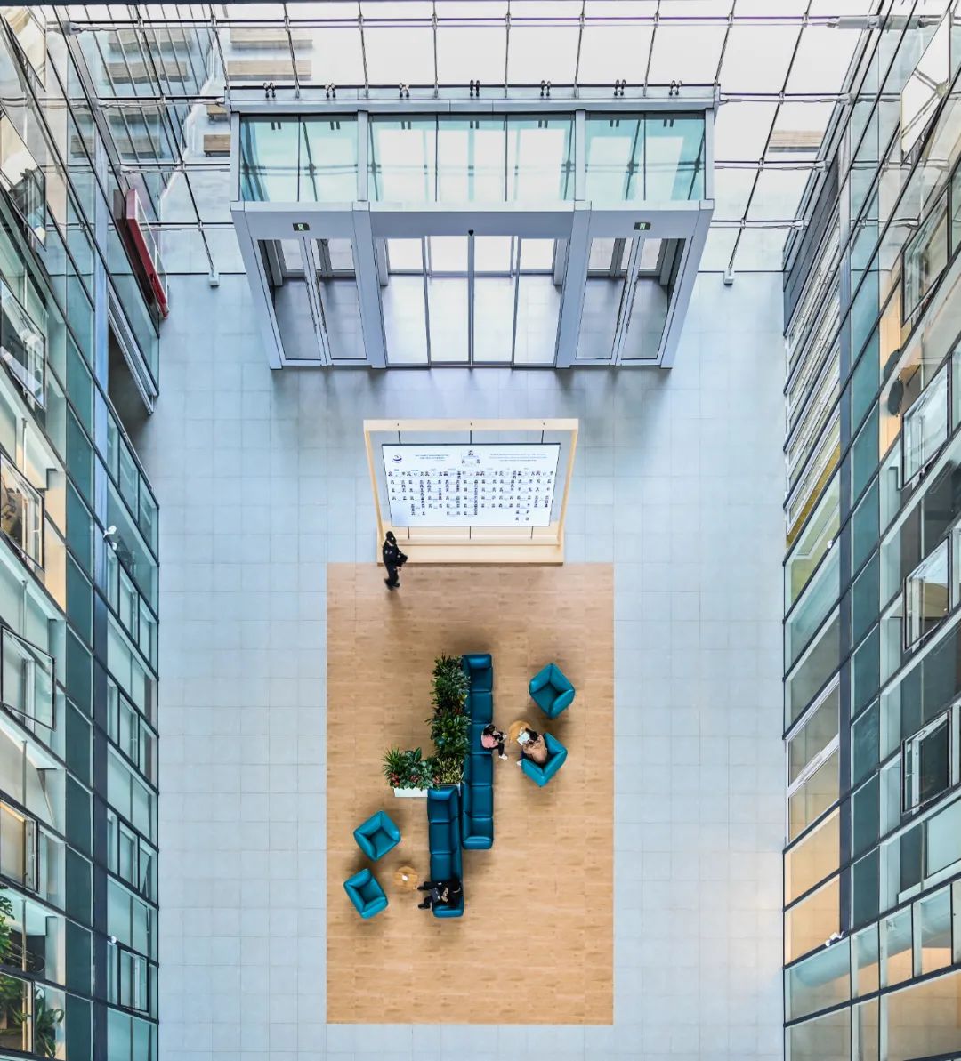 在中庭外立面高达36米的超大尺度低辐射拉索玻璃幕墙上,特别设计了金属排水系统。有别于传统向外散排的模式,金属排水系统向内收集雨水,再经窗台两侧落水管排至地面,可最大限度减少雨污流挂,确保外立面干净明亮。玻璃幕墙在遮蔽雨水与炙热阳光的同时,还能调节室内温度、降低建筑能耗,更加经济环保。部分内部空间设置了感应开关,员工离开后会自动关灯,不造成电的浪费。