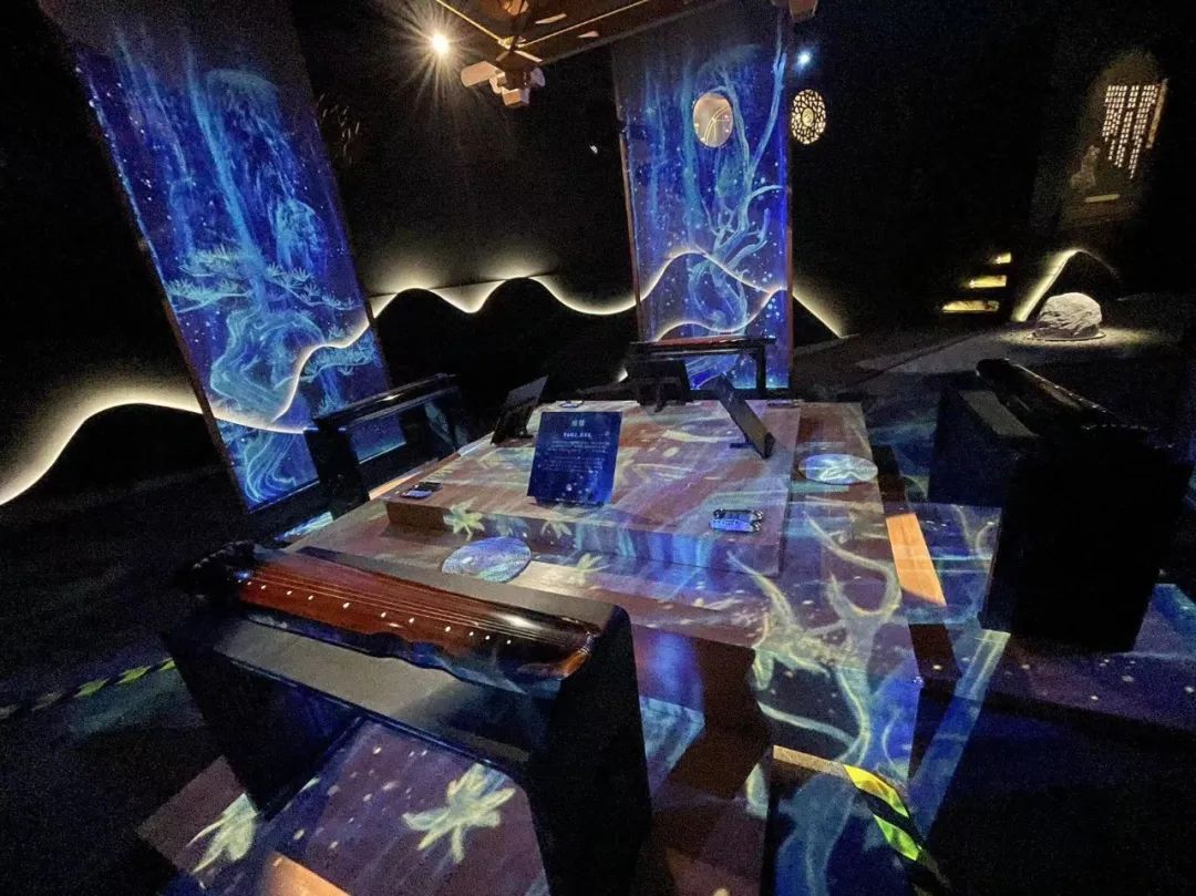 “号钟”“绕梁”“绿绮”“焦尾”四大名琴齐聚,进入庭院,空间四面悬挂着大型“画卷”,伴随沉静悠远的古琴声,画卷中流水如瀑,为静谧的“抚琴亭”烘托出禅意的氛围。