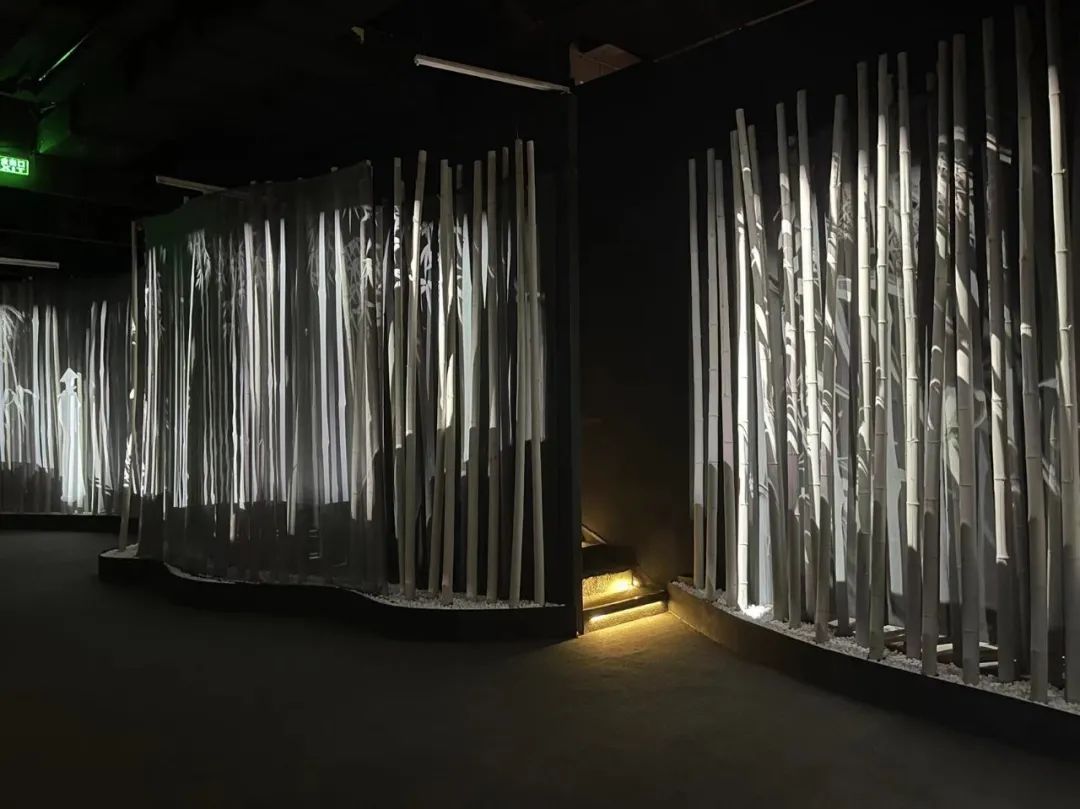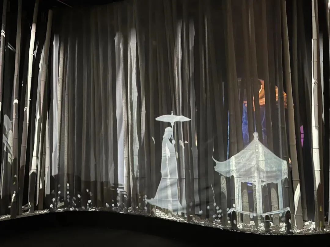 “成片”的竹林构成沉浸式影像空间,有纵深感的竹林成像面上,游客行走在大面积竹林中的小径上,仿佛置身武侠场景,随机体验江湖中的文人清雅,悠然自得的惬意或侠客刀光剑影,感受肃杀紧张的氛围。