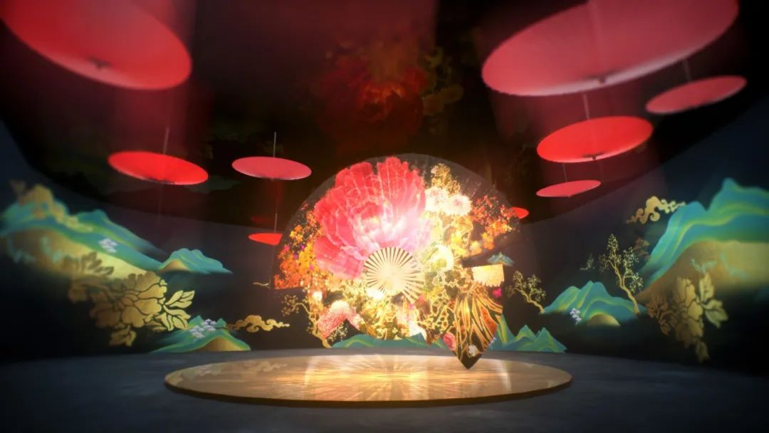 巨大的扇形构建起沉浸式光影音乐空间,内容以主视觉中的小妹穿越山峦、流水、亭台、水榭等古风场景,同时结合笛子、琵琶、古筝、阮、二胡等五种具有历史传承感和延续发展的民族乐器进行演奏,最终形成多种乐器协奏,展现中国文化本身的活力与持久的生命力,也展现充满想象力与生命力的乐与舞。