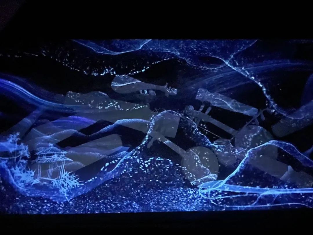 在12米长的纱幕投影和背后悬吊的由多种乐器构成的艺术装置空间,乐器组合概念装置(模型)和纱幕影像内容叠加,配合灯光渲染,形成美轮美奂的视听感受。