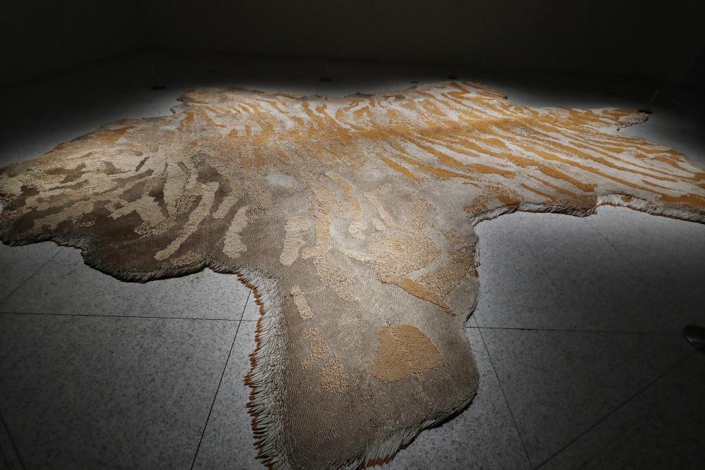 展览现场,徐冰从上世纪八十年代以来的七十余组代表作和最新力作,分布在浦东美术馆一层和三层。这些作品包括版画、装置、文献记录、手稿、影像、纪录片。