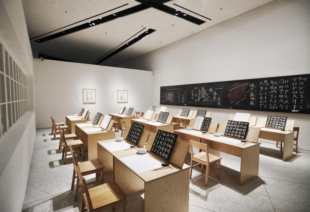 三层展厅,进入观众视线的第一件作品是参与型装置《英文方块字书法教室》。在东方意境极强的展厅区域,长卷式的审美形式以既传统又当代的方式呈现在眼前。当观众在教室书写这些看似中文实为英文的书法时,将会获得从未有过的体验。
