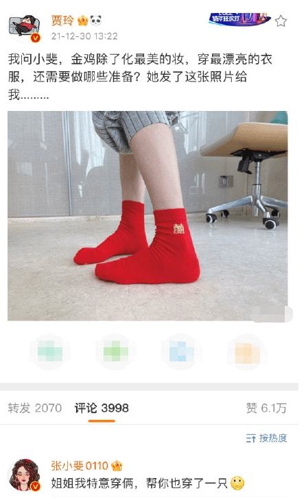 网易娱乐12月31日报道 30日,张小斐获金鸡奖最佳女主角,而贾玲则遗憾与最佳导演处女作失之交臂。随后,贾玲发文称“袜子!袜子!快把袜子给姐套上!”而颁奖典礼开始前,贾玲还晒出张小斐穿的红袜子,回应了自己未获最佳导演处女作一事。网友也在下方送祝福与安慰,“蹭蹭金鸡奖女主的袜子”“恭喜你们,你们都做到了”等。