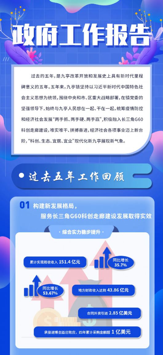 近日,“活力九亭”发布九亭镇《政府工作报告》,干货满满,带你一图读懂!