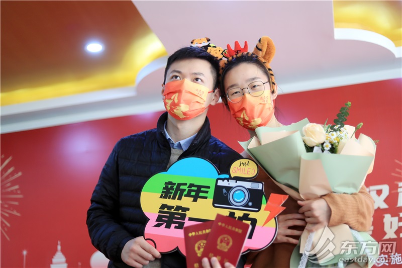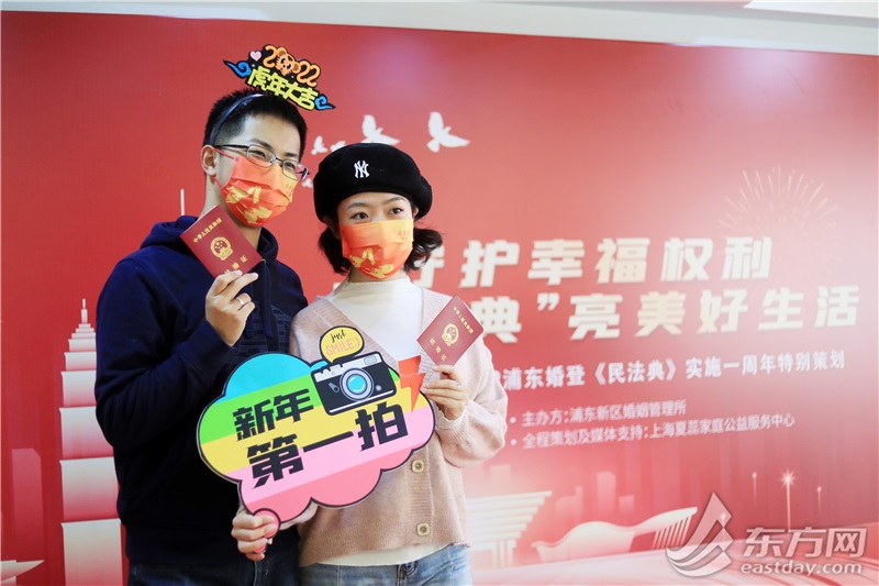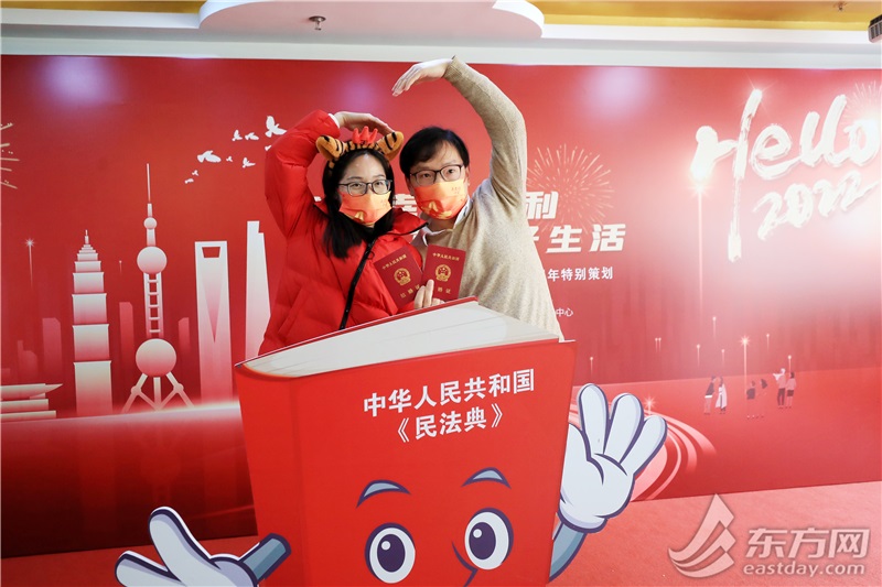 在“新年第一照”的合影区域,不少新人正在有条不紊地排队等候拍摄,这也成为了婚登现场最具人气的互动环节。浦东新区婚姻管理所相关负责人表示,“今天是元旦佳节,又恰逢《民法典》实施一周年,具有特别的纪念意义,我们以新年第一照的形式,见证新人们这份‘初心’,让他们既能够开心迎接新年,在结婚登记中得到难忘精彩的体验,也能够有所收获,更多了解我们《民法典》,更好地了解责任和义务,守护家庭幸福。”