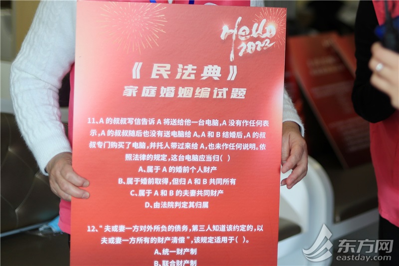 东方网记者柏可林1月1日报道:“甲方请求返还彩礼的主张,下列哪项情况不能得到支持?……”“D!”在浦东新区婚姻管理所,一场由新人男女双方作为两队的《民法典》知识竞答正在如火如荼展开。