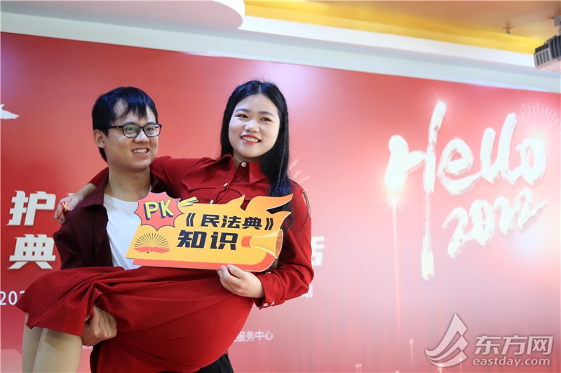 今天是《民法典》实施一周年纪念日,浦东新区婚姻管理所特别策划了这场普法宣传竞答。记者现场观察到,超过六成女方获胜,可见现代女性对《民法典》尤其是婚姻家庭编的关注程度相当高。此外,在辞旧迎新之际,特别为新人设置了“新年第一照”拍摄互动,见证新人领证后的第一张新年照,也是见证新婚后的初心照。