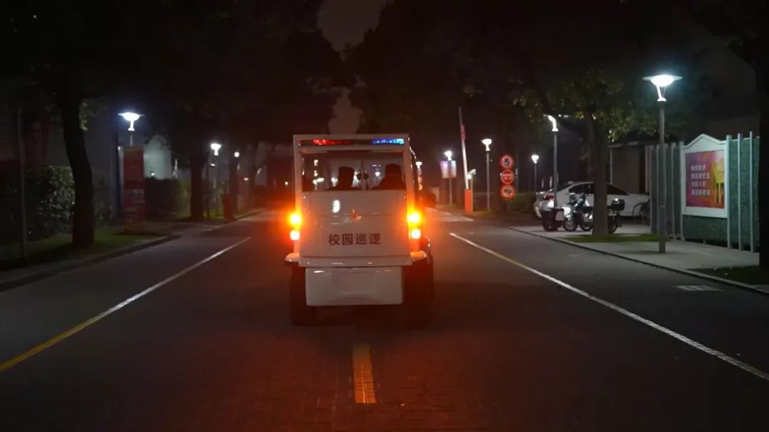 ▲奚永辉和同事在校园内开展夜间巡逻