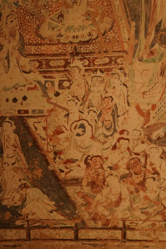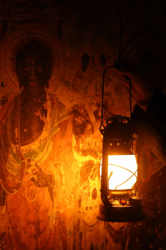 第二个展厅其实是一个通道,也是一个220窟的复制窟,采用了敦煌研究院数字化研究所制作的高清图像。在这里你只能用提灯去观赏壁画,一时间就好像站在莫高窟洞窟内、身临其境。