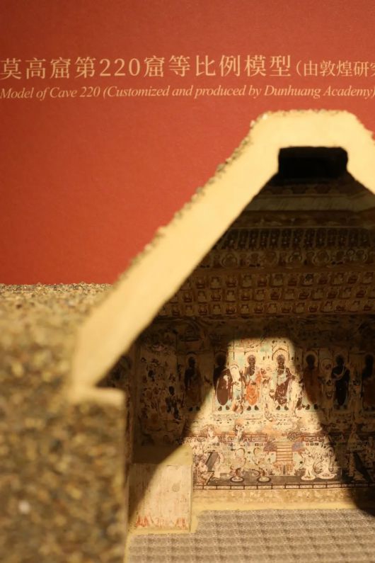敦煌研究院特别为展览定制了第220窟全窟迷你模型,是历年展览中最大的迷你窟,高清再现窟内壁画细节。这个展厅里,还有诸多关于第220窟的各种元素的解读、图样等。记得结合展板上的文字,仔细观看研究一下噢。