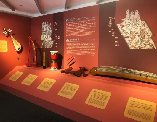 220窟北壁药师经变的乐舞图绘有一组盛大的乐队,据史料记载唐代乐器有300多种。第三个展厅展示仿制乐器,样式来源于壁画,表现的都是唐代最流行的乐器。