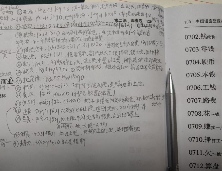 拥挤的房间内,重复上演一些类似的场景。朱瑞祥老师说一句方言,八位学生随后重复朱瑞祥念过的词汇。所以房间内间歇性地出现“看看”“开开”“试试”等方言词汇的重复声。在调查过程中,岳立静教授强调:“老师亲自读,要核查,要反复确认。”岳教授口中的老师就是朱瑞祥。