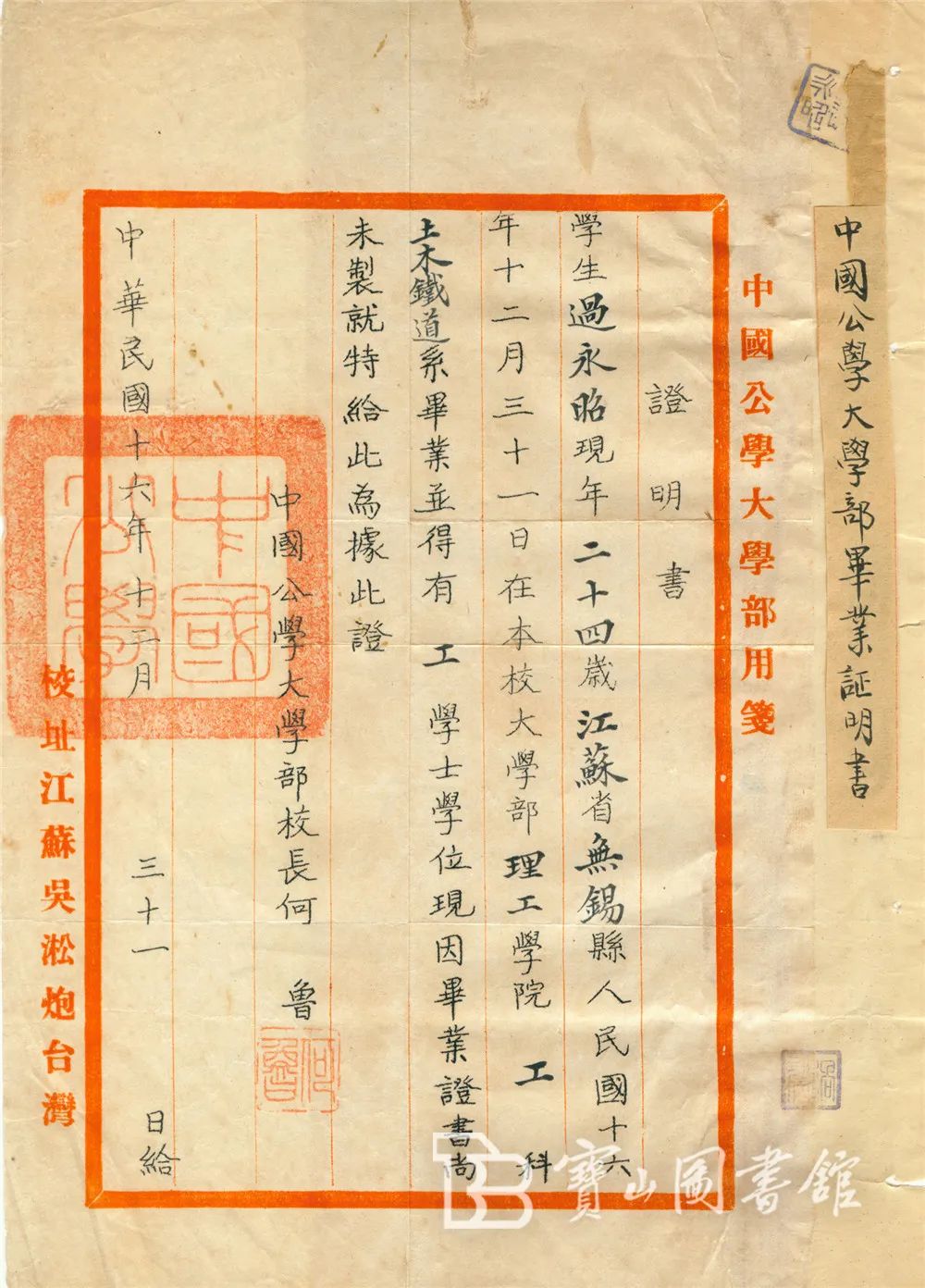 图片说明:1927年12月31日,过永昭中国公学证明书