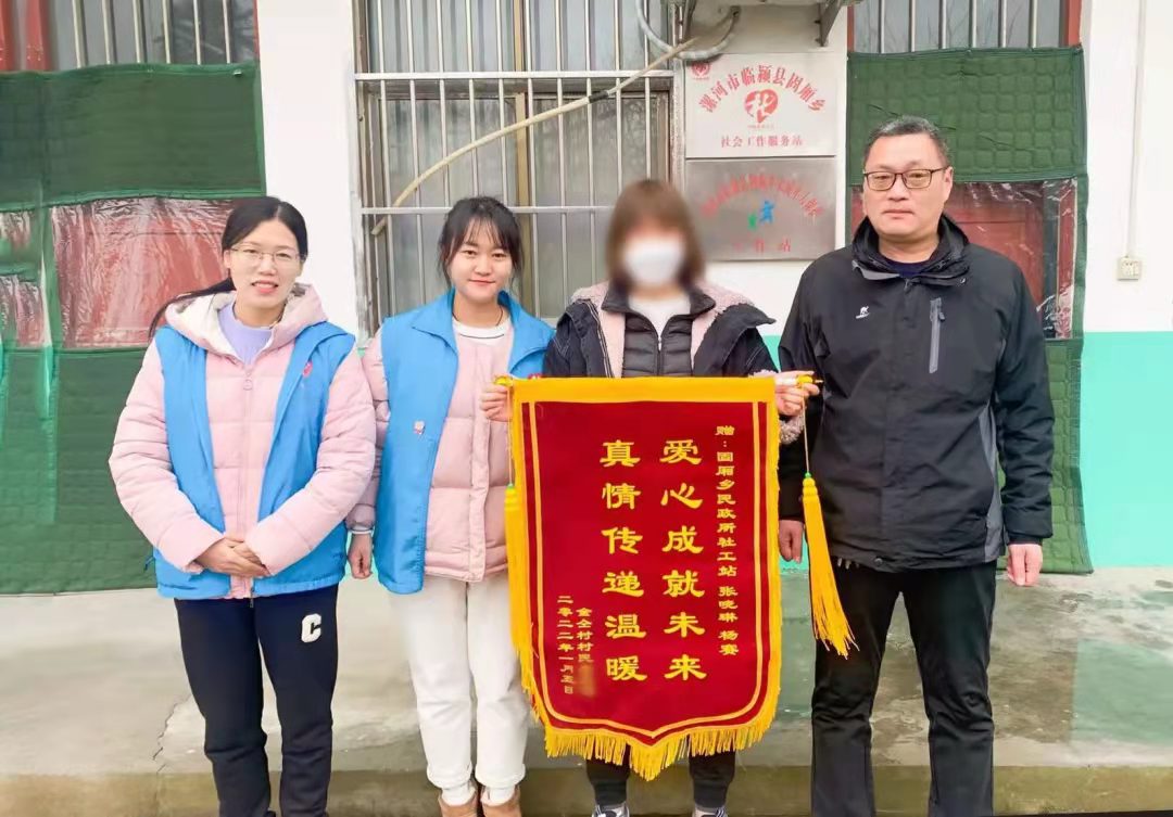 (图:图一是服务对象家属为漯河市临颍县固厢乡社工站赠送锦旗表达谢意)