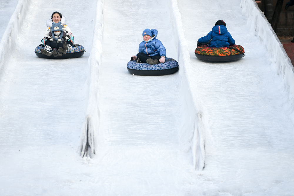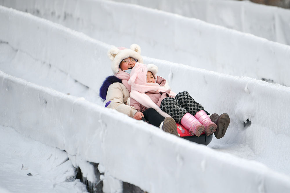 ↑1月9日,在扎兰屯市吊桥公园内,市民在体验冰滑梯。新华社记者 贝赫 摄