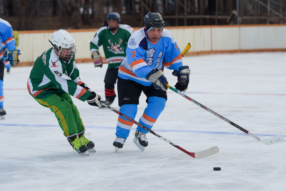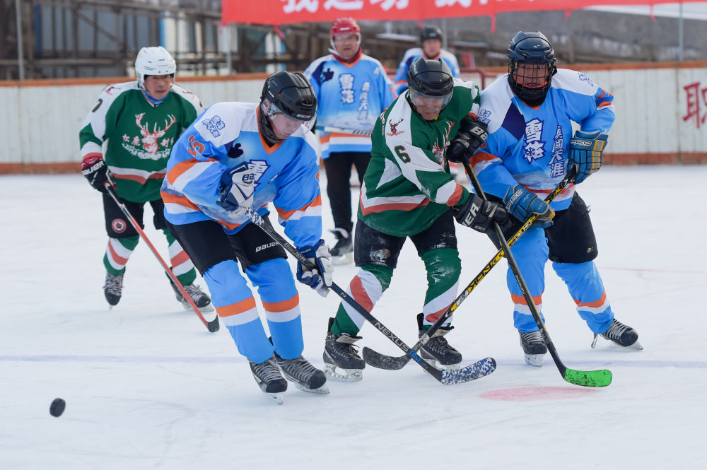 ↑1月9日,在扎兰屯市吊桥公园内,冰球爱好者在打冰球。新华社记者 贝赫 摄