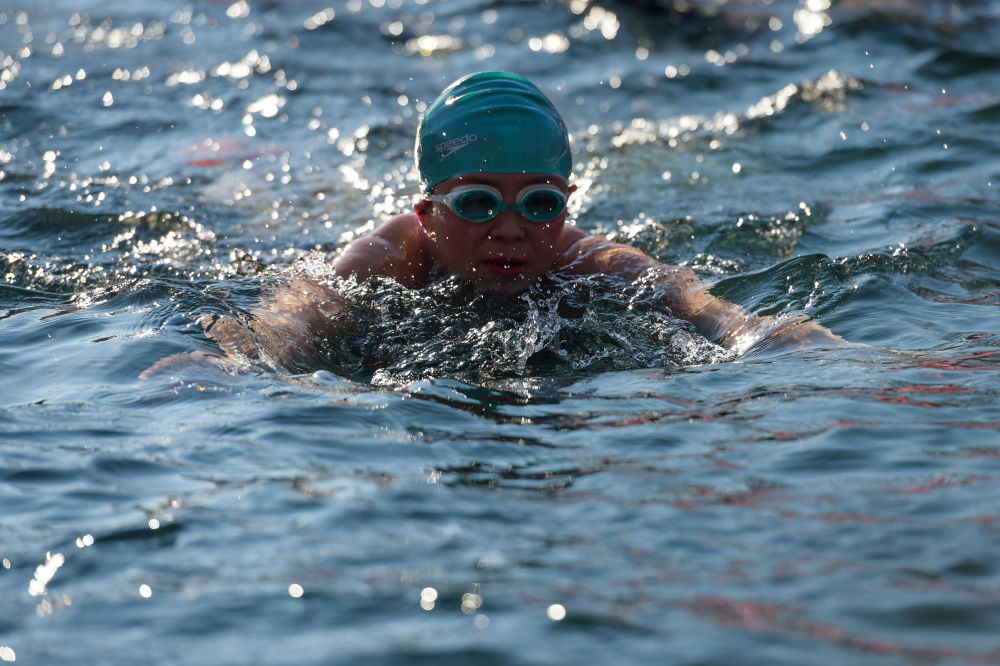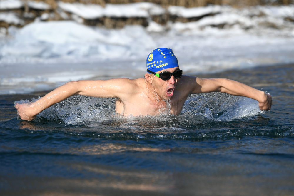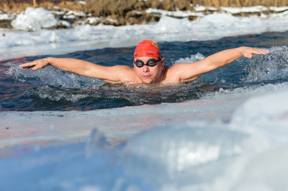 ↑1月9日,在扎兰屯市一处冬泳场地,一名冬泳爱好者在游泳。新华社记者 贝赫 摄