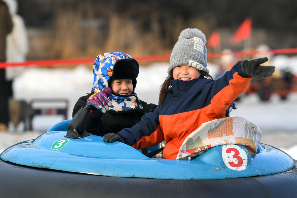 ↑1月9日,在扎兰屯市吊桥公园内,两名小朋友在体验冰上碰碰车。新华社记者 贝赫 摄